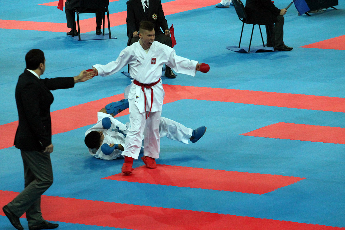 Nasz zawodnik w pierwszej walce trafił na zawodnika z Anglii, Pajhana Jaffarim z którym wygrał przez wkazanie 5 do 0 przy stanie 0 do 0. Druga walka z Rosjaninem Daniłem Greckim zakończyła się niestety przegraną 2 do 0 ale na szczęście Rosjanin dobrze się spisał i awansował do finału dając naszemu zawodnikowi szansę walki o brąz. Ta okazję Krzysiek wykorzystał w 100 procentach. W repasażach prezentował się świetnie, widać było że kontroluje to co dzieje się na macie i można powiedzieć że dosyć pewnie wywalczył bardzo ważny medal Mistrzostw Europy. Krzysiek kolejno wygrywał z zawodnikiem z Andory Melchorem Rabego 4 do 0, potem z Portugalczykiem Diego Texeirą 1 do 0 i wreszcie w małym finale wygrał z Czechem Kocandrle 3 do 1. Medal wywalczony został w kategorii kadet w wadze – 63 kg. Pozostałe medale dla Polski to zasługa zawodników z Pleszewa. Magda Godlewska wywalczyła srebro w kumite kadetek w wadze + 54 kg a Dawid Sobkowiak brąz w kumite kadetów + 70 kg. Cieszymy się bo widać progres w Polskim karate i już głośno i wyraźnie mówi się że Polska idzie do przodu.