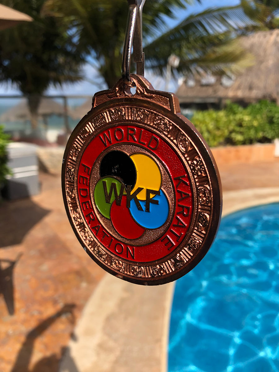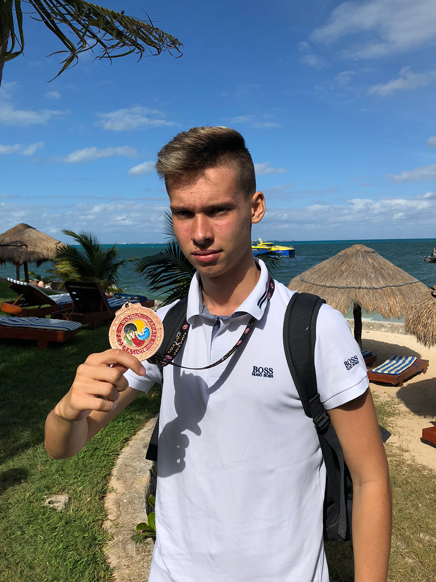 Krzysztof w pierwszej rundzie uległ świeżo upieczonemu młodzieżowemu Mistrzowi Olimpijskiemu Mahauden Quentin /BEL/ 7 do 1. Wynik wysoki, nasz zawodnik przespał początek walki i zrobiło się 6 do 0, potem już było całkiem dobrze, było też kilka szans na odrobienie strat. Dzięki temu że Belg dostał się do finału nasz zawodnik mógł dalej walczyć o brązowy medal. Tu spisał się świetnie. W pierwszej walce pokonał Meksykanina Guzman Gonzalez Christian 5 do 1, następnie poprzez przewagę senshu Matiasa Nicolopulosa z USA wynik 3 do 3. W walce o brąz z Vladislavem Taldykinem z Rosji było bardzo gorąco. Początek był bardzo dobry, Krzysiek uzyskał przewagę trzech punktów ale czym bliżej do końca tym przewaga topniała. Finalnie walka zakończyła się wynikiem 4 do 4 z naszą przewagą dzięki czemu Krzysztof Szewczyk zdobywa kolejny medal na oficjalnych zawodach World Karate Federation, organizacji która już w 2020 zadebiutuje na seniorskich Igrzyskach Olimpijskich Tokio 2020. Nasz zawodnik ma już medal z Mistrzostw Świata, Mistrzostw  Europy a teraz drugi medal z Youth League. Brawo ! Drugi medal dla Polski wywalczył Dawid Sobkowiak /Pleszewski Klub Karate/. Polak wywalczył srebrny medal w kumite juniorów w wadze + 76 kg.