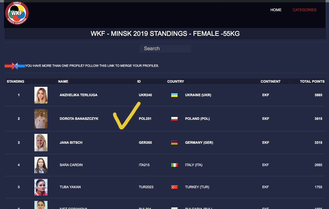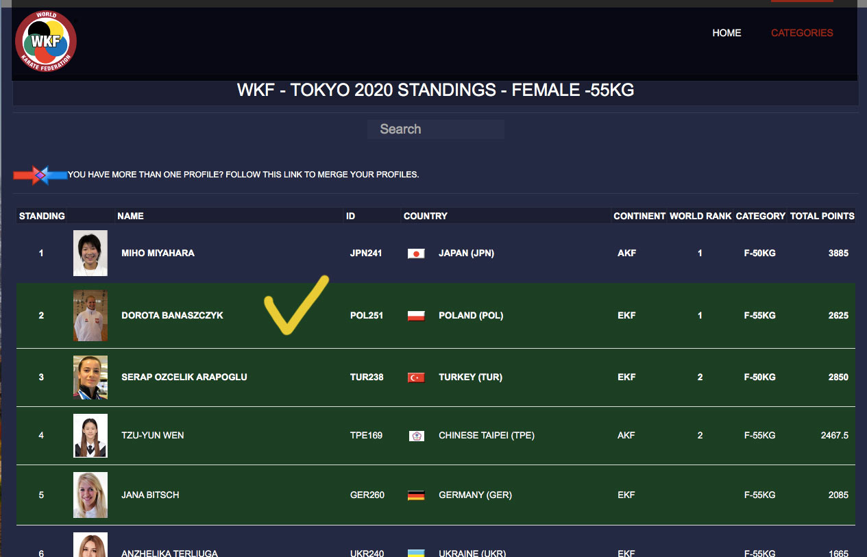 Mamy świetne informacje Dorota Banaszczyk jest na drugim miejscu w rankingu Olimpijskim do Tokio 2020 w kumite w wadze – 55 kg a na pierwszym z pośród kwalifikujących się zawodniczek z rankingu. Przypominamy że premiowane miejsce mają tylko pierwsze cztery zawodniczki/zawodnicy rankingu, nie licząc zawodników z Japonii którzy jako gospodarze mają zapewniony start. Drugim etapem kwalifikacji będzie turniej kwalifikacyjny /Paryż 2020/ z którego bezpośrednio awansuje po 3 zawodników z kategorii wagowej.