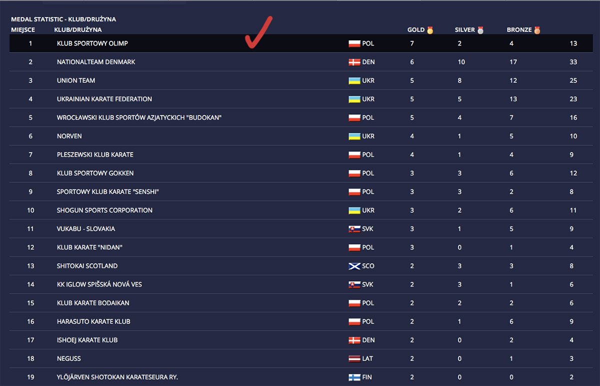 Emocje trwały do samego końca dwudniowych zawodów. Ostatnią konkurencją było kumite drużynowe chłopców U14. W finale spotkała się drużyna Olimpu Łódź z drużyną Union Lwów /bardzo znany ukraiński klub/. Stawka pojedynku było zwycięstwo w klasyfikacji generalnej. Doping ponad 100 osobowej ekipy z Lwowa i oczywiście polskich kibiców. Wielkie emocje na hali przy ul. Małachowskiego, pierwsza walka na korzyść klubu z Ukrainy ale następne walki to już popis zawodników Olimpu. Wielka radość i pierwsze miejsce w klasyfikacji