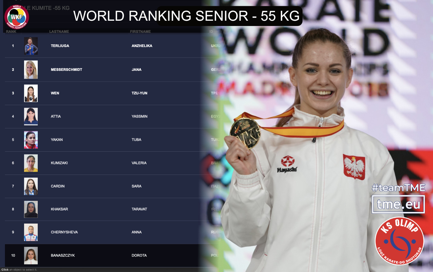Aktualnie na Topie cały czas jest Dorota Banaszczyk. 10 miejsce w światowym seniorskim rankingu plus świetny występ w turnieju kwalifikacyjnym w Paryżu powoduje że mamy zawodniczkę w absolutnej elicie Światowego Karate. Warto przypomnieć że Dorota była o milimetry od startu w IO zajmując 4 miejsce w głównym turnieju kwalifikacyjnym w Paryżu. Decydującą walkę stoczyła z aktualną Mistrzynią Olimpijską Ivet Goranovą. Walkę zaciętą i wyrównaną z szansami na punkty dla Doroty, zabrakło naprawdę niewiele.