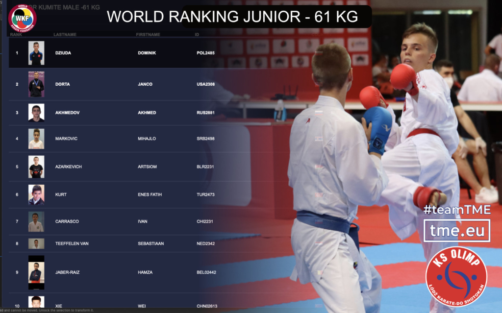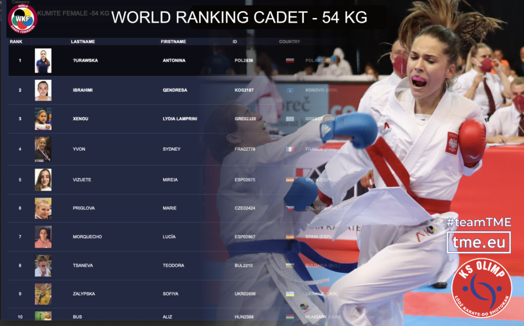 Cieszy nas też pierwsze miejsce Antoniny Żurawskiej w kategorii kadet – 54 kg. Pierwsze miejsce w rankingu World Karate Federation to zawsze duże wydarzenie i wynik dobrej postawy na zawodach międzynarodowych. Brawo Tosia!