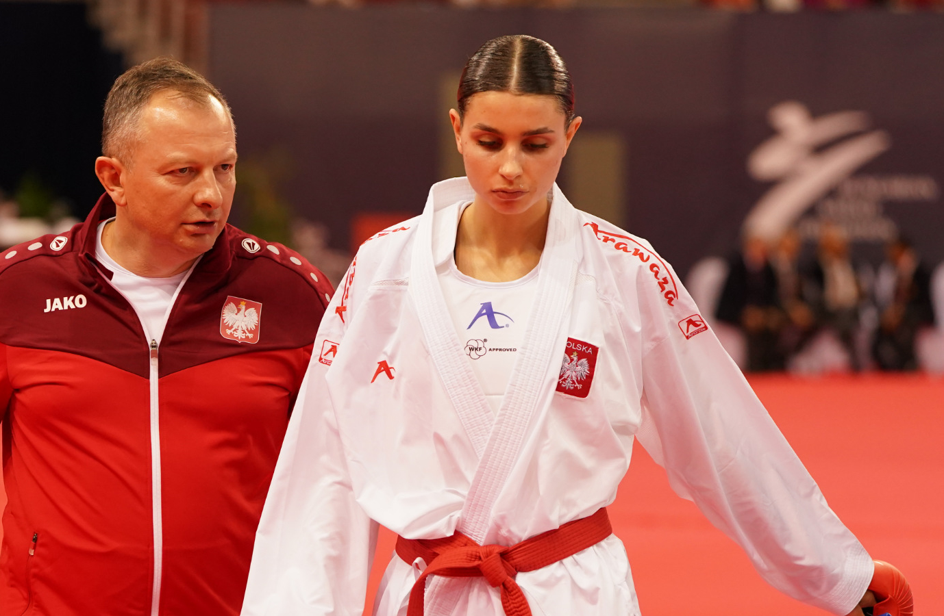 Kseniya jednak pokazuje klasę. Pomimo młodego wieku /18 lat/ pewnie wychodzi do walki z Francuzką i zwycięża 3 do 0. Potem walka z zawodniczką z Grecji i wszystko układa się po naszej myśli, Kseniya prowadzi walkę, ma przewagę jednego potem dwóch punktów ale niestety chwila nieuwagi i walka kończy się remisem 2 do 2. Przypominamy że w systemie round robin czyli systemie rozgrywania turniejów gdzie zawodnicy dzieleni są na grupy i walczą każdy z każdym, są remisy. Remis 2 do 2 daje naszej zawodniczce jeden punkt i ostatnia walka z Mistrzynią Świata z Turcji ma zdecydować kto wyjdzie z grupy. I tutaj dzieje się coś niesamowitego. Kseniya wychodzi bez respektu, od początku prowadzi walkę, uzyskuje przewagę nie tylko optyczną ale też punktową. Piękna technika nożna ura mawashi geri, potem jeszcze kizami zuki i walka kończy się naszym zwycięstwem 4 do 1. Kseniya Dronchanka wychodzi z grupy do ćwierćfinału, gdzie czeka na nią brązowa medalistka ostatnich Mistrzostw Świata Barbara Perez z Wenezueli.