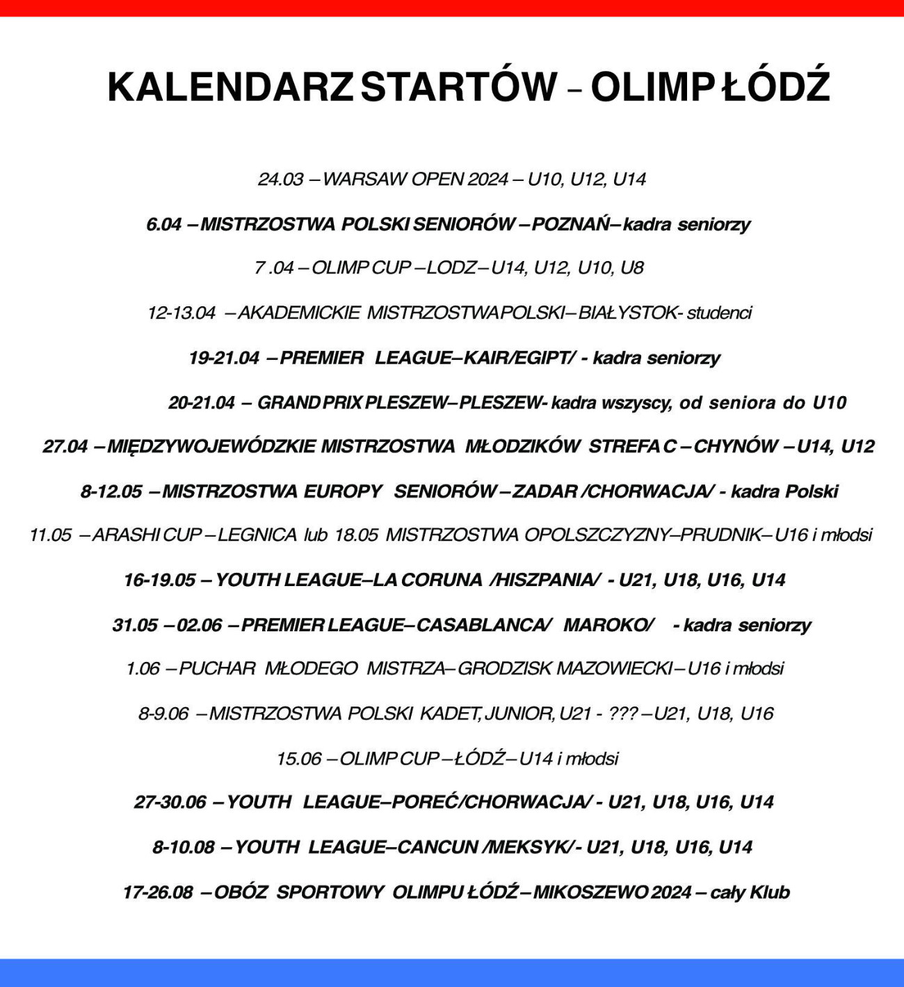 Poniżej prezentujemy kalendarz startów dla zawodników Olimpu Łódź.