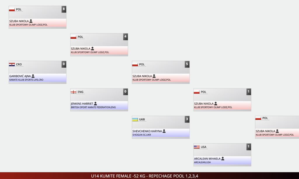 Maja Woźniak w kategorii U14 + 52 kg kolejno walczyła z: zawodniczką z USA, 3 do 3 wygrana poprzez przewagę senshu, następnie pokonała zawodniczkę z Egiptu 7 do 4, potem Słowaczkę pokonuje 4 do 3, w walce ćwierćfinałowej ulega Ukraince 9 do 1, Ukrainka dostaje się do finału a potem wygrywa te zawody a Maja walczy w repasażach. W pierwszej walce pokonuje Chorwatkę 3 do 3 poprzez przewagę senshu, w walce o brąz ulega 3 do 0 zawodniczce z Łotwy.