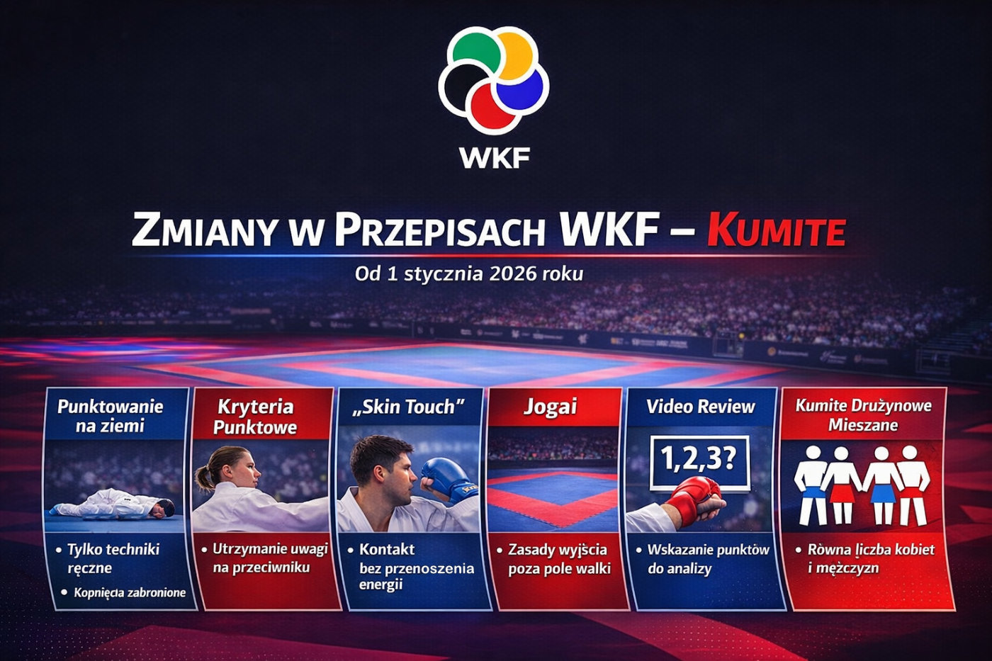 Od 1 stycznia 2026 roku wchodzą w życie zmiany w przepisach WKF Competition Rules. Choć mają one w dużej mierze charakter porządkujący i doprecyzowujący zapisy regulaminowe, kilka z nich ma istotne znaczenie dla zawodników, trenerów i sędziów w konkurencji kumite.